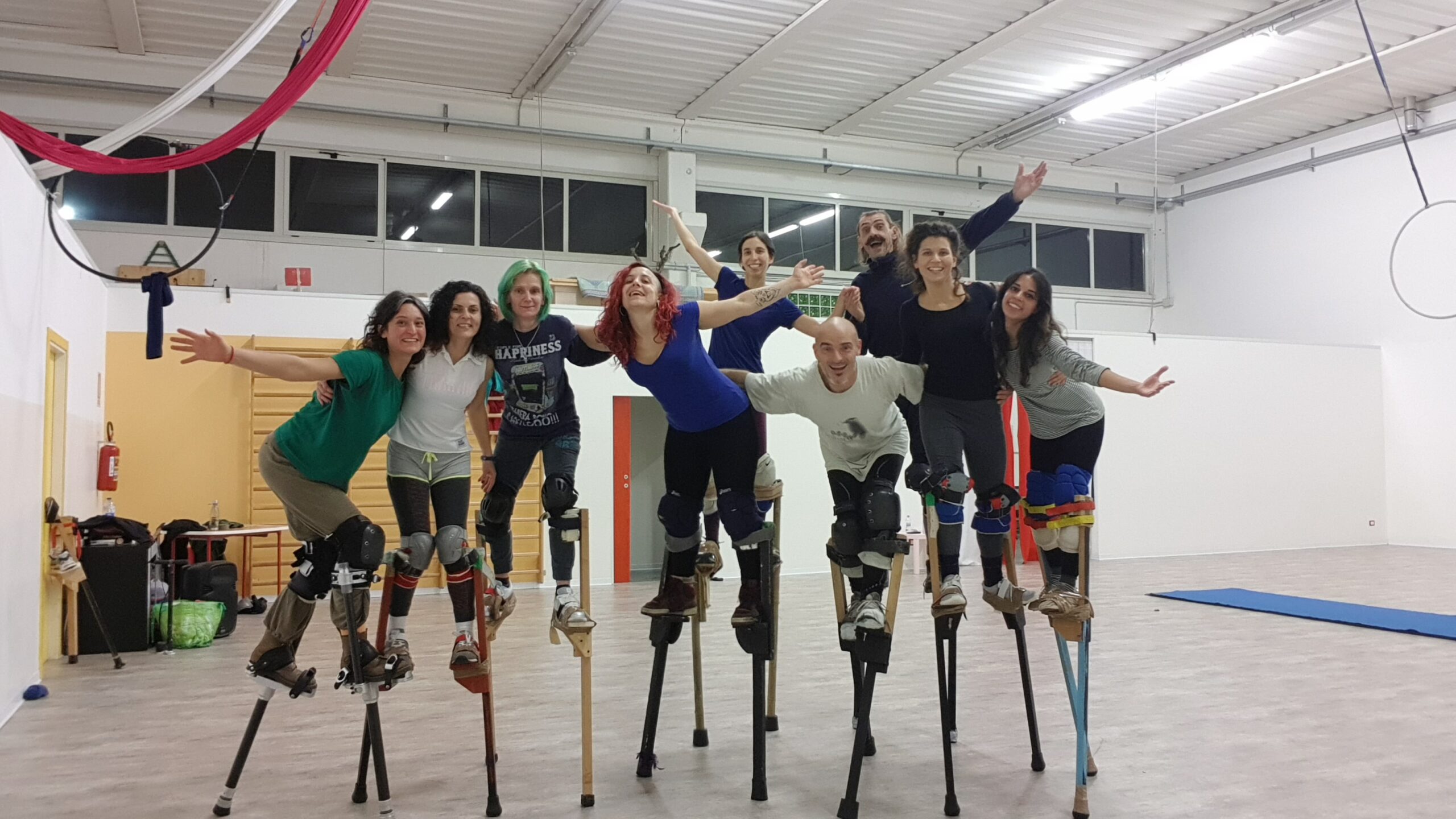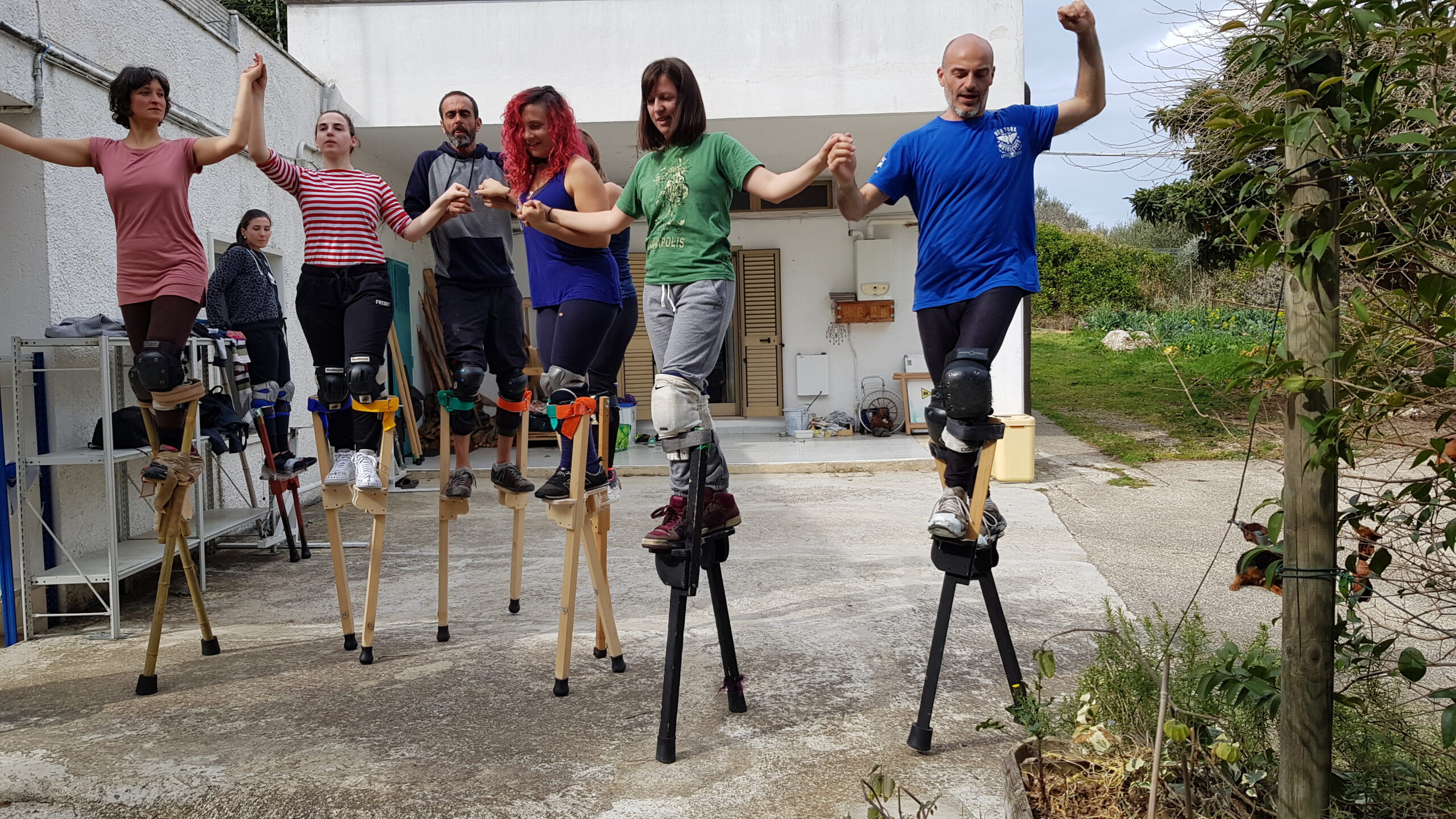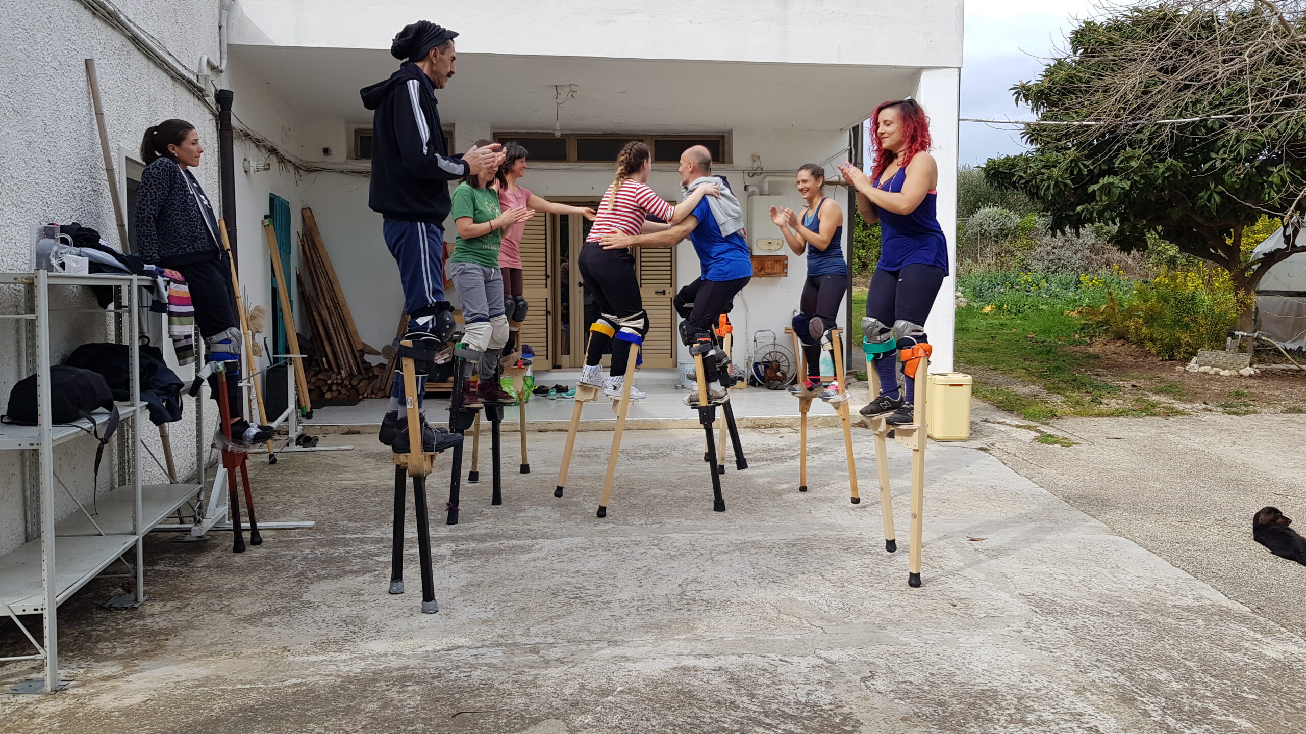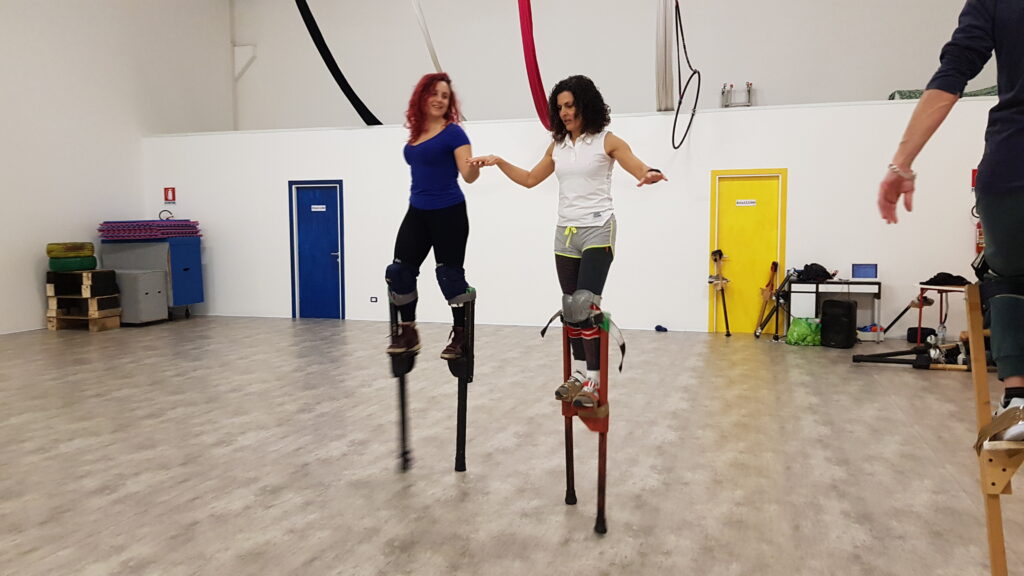 Corpo della lezione: Trampoli. Andature, timing, salite e discese. Acrobatica soli, in coppia. Improvvisazione di gruppo.