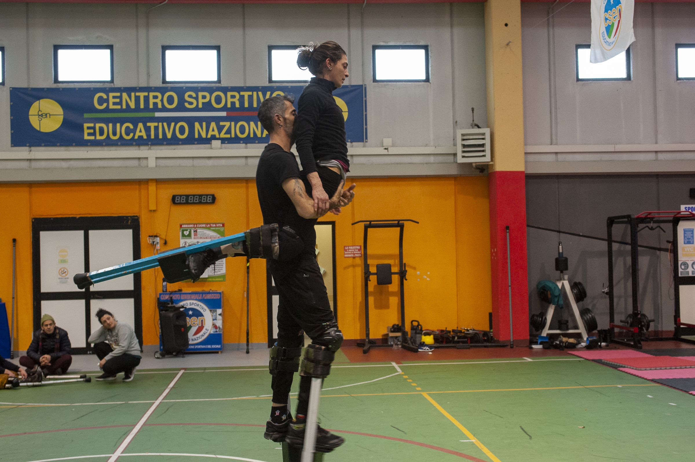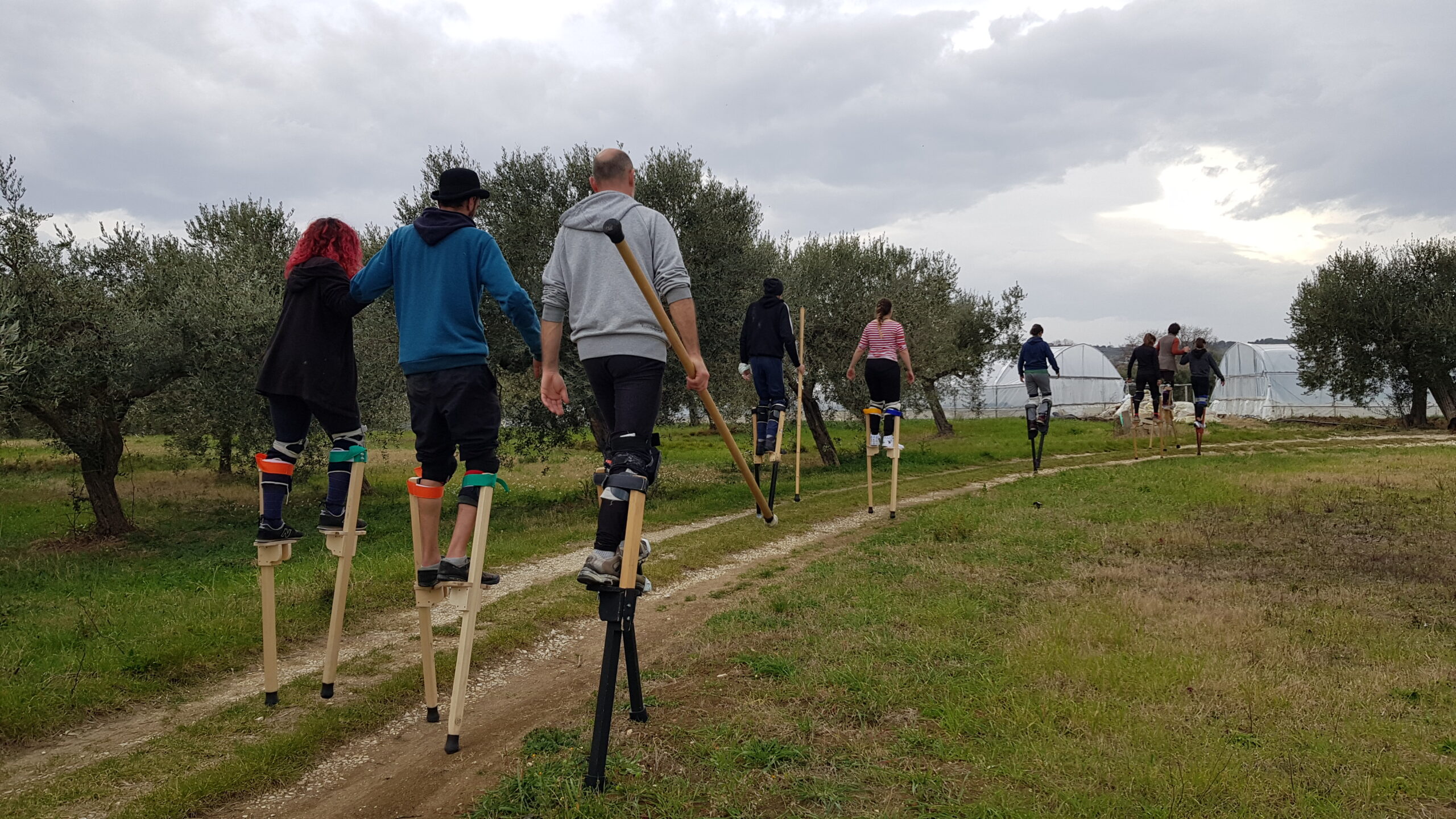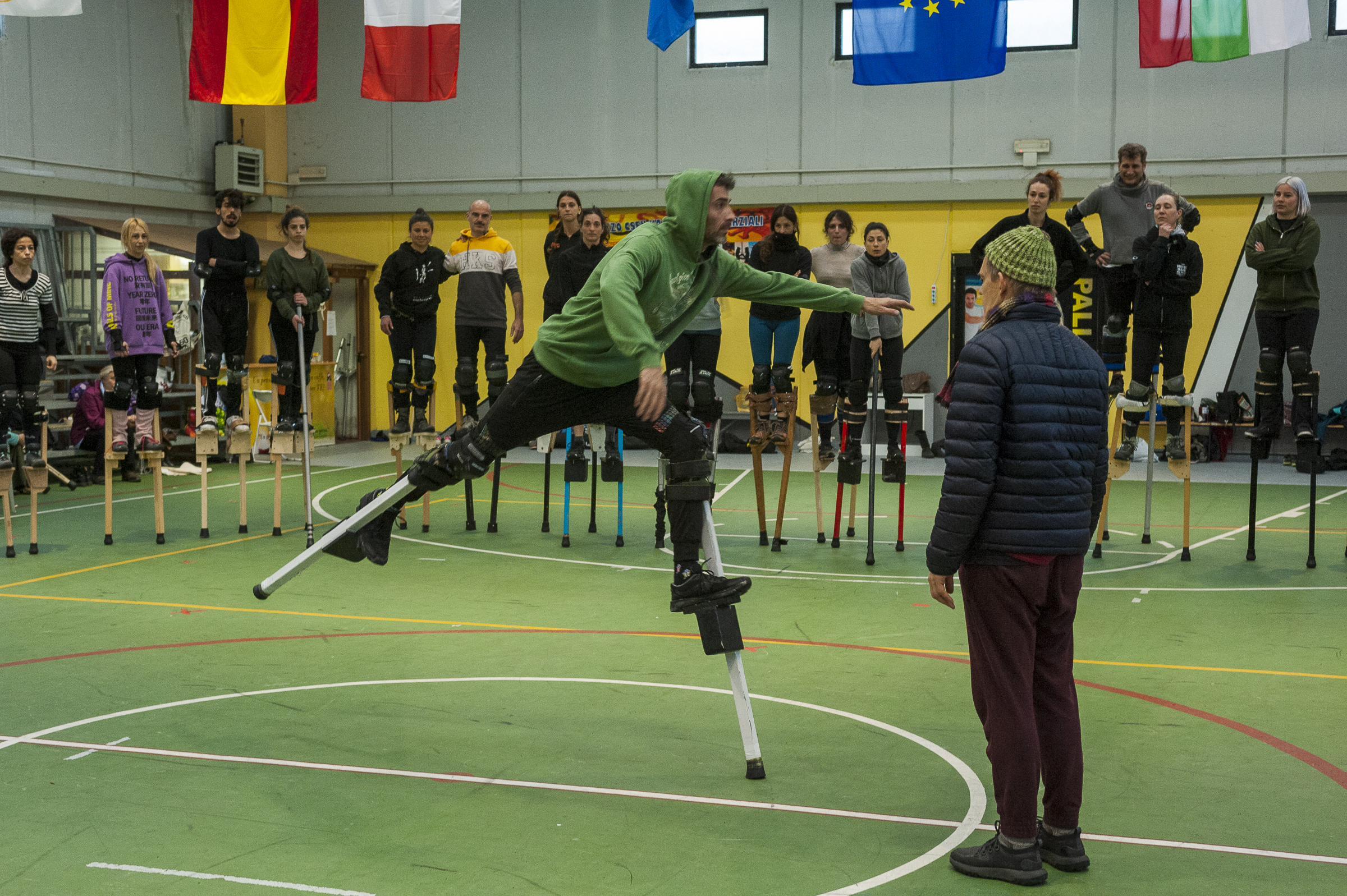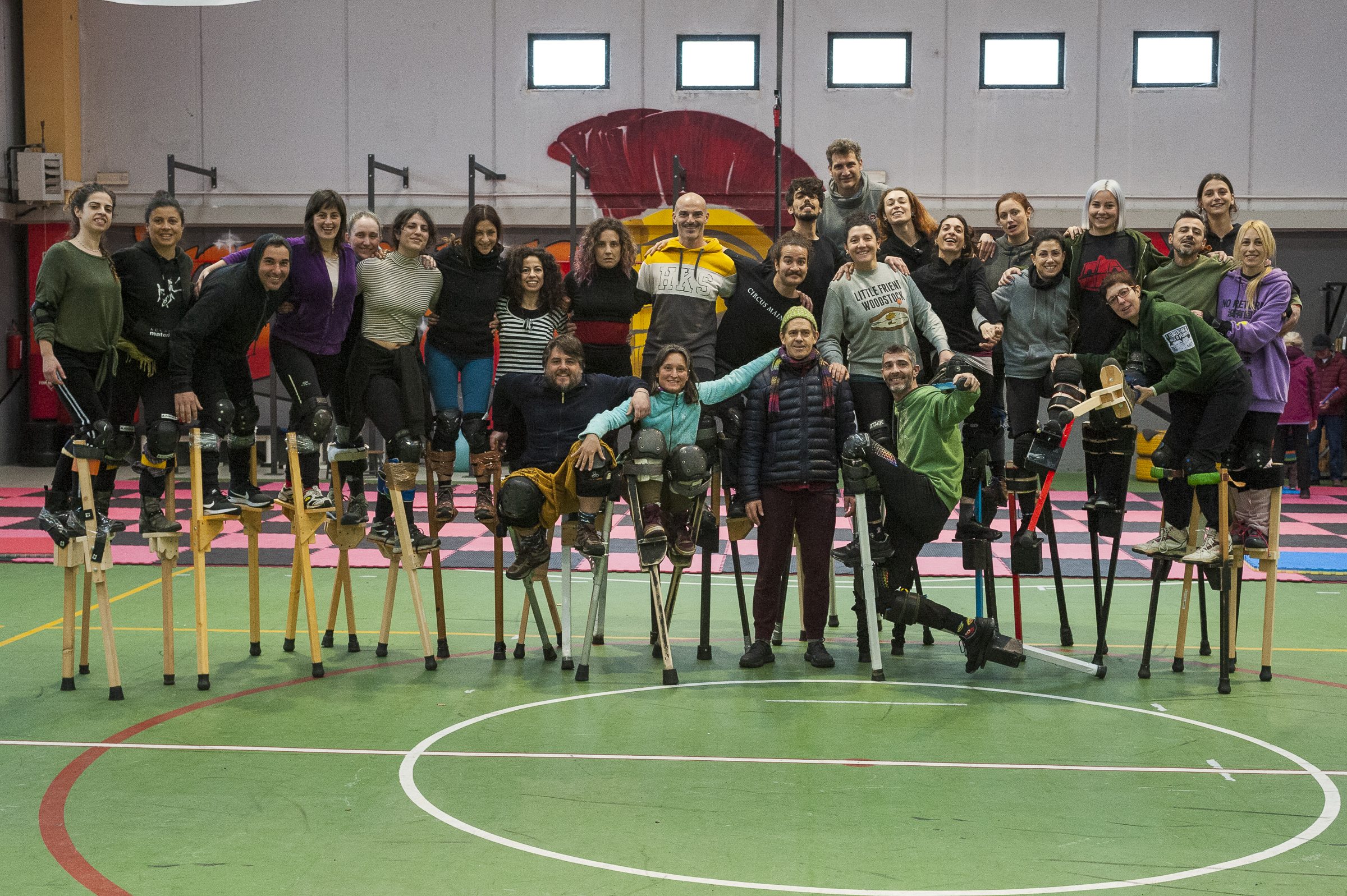Corpo della lezione: Trampoli. Andature, timing, salite e discese. Acrobatica soli, in coppia. Improvvisazione di gruppo.