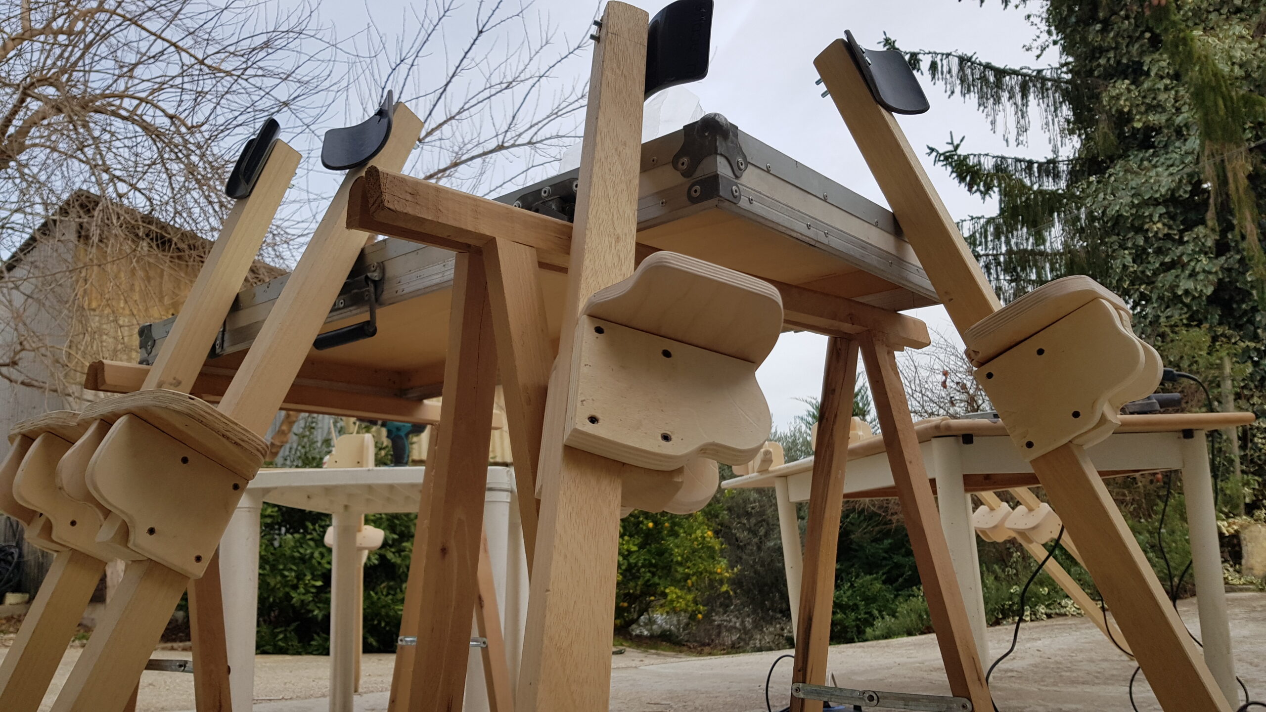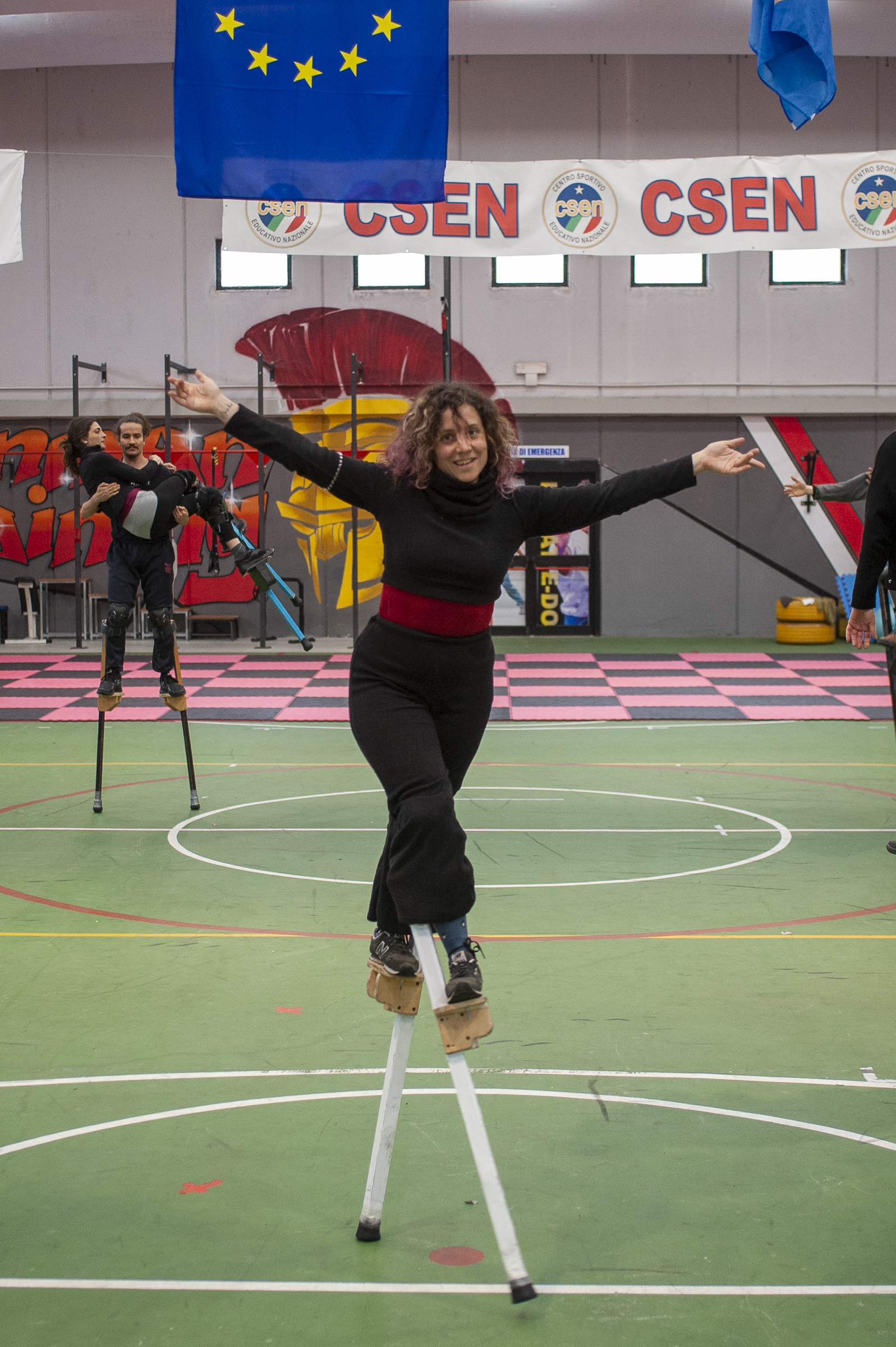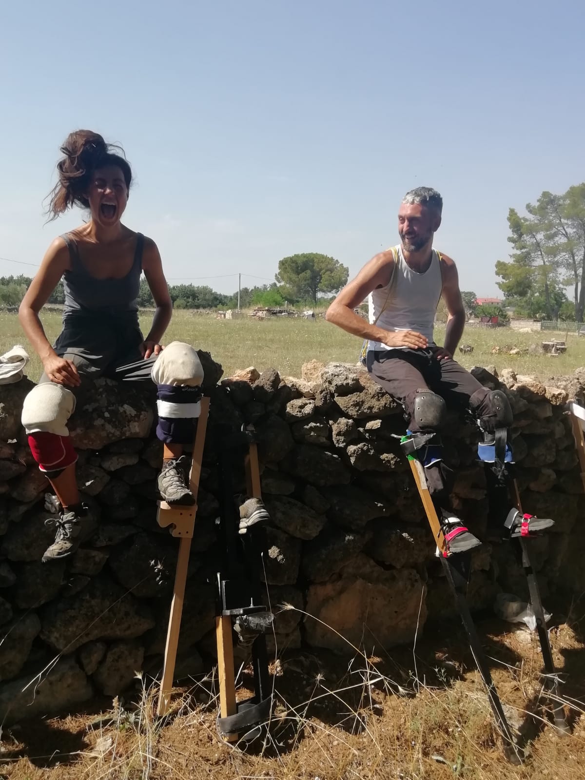 Corpo della lezione: Trampoli. Andature, timing, salite e discese. Acrobatica soli, in coppia. Improvvisazione di gruppo.